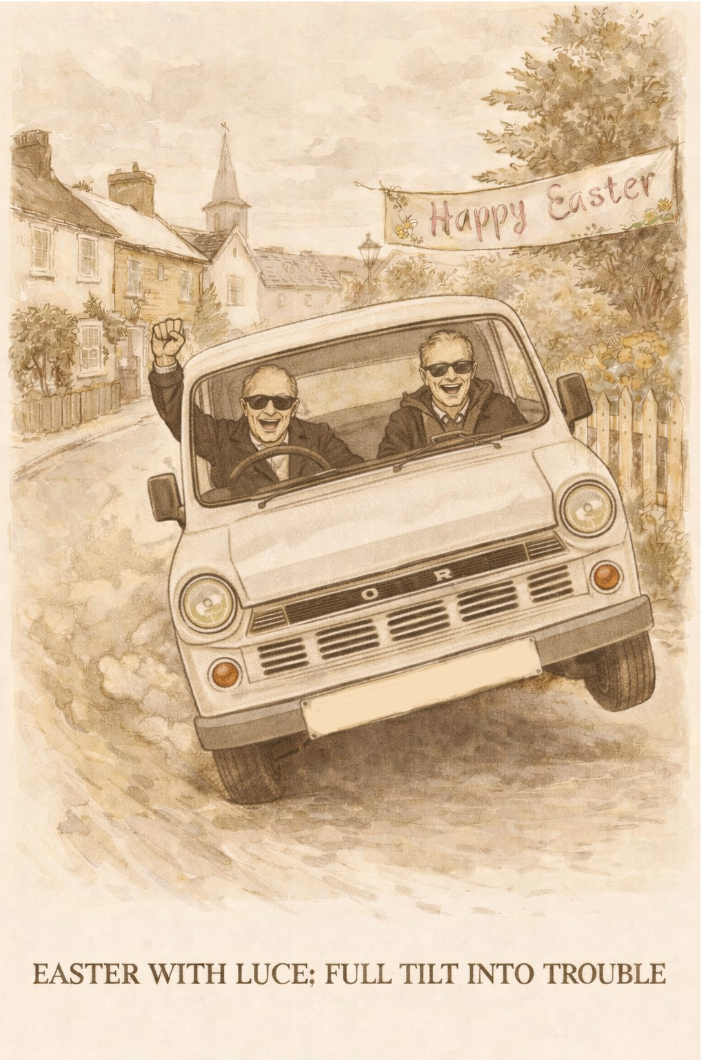 I sat on the steps with a cup of tea, observing the chaos unfold. Dad and Frank had gone full tilt into trouble now — sleeves rolled, sunglasses on (don’t ask me why), and muttering like two World War 2 codebreakers. They’d somehow roped me in to “just hold this corner for a sec” which, twenty minutes later, meant I was half tangled in canvas and contemplating my life choices.